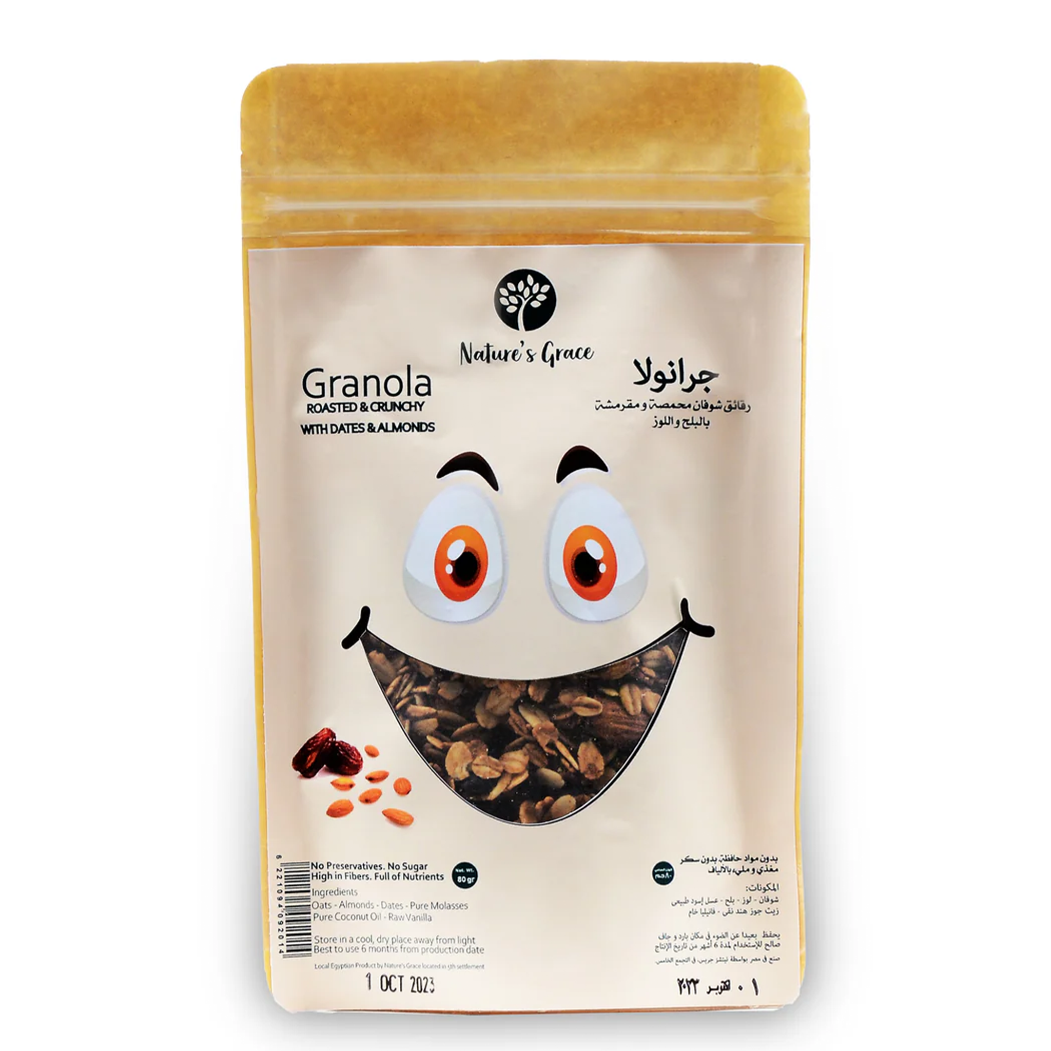 جرانولا ناتشرز جريس تحتوي على التمر الحلو واللوز المقرمش للحصول على وجبة خفيفة غنية بالعناصر الغذائية أو خيار للإفطار.