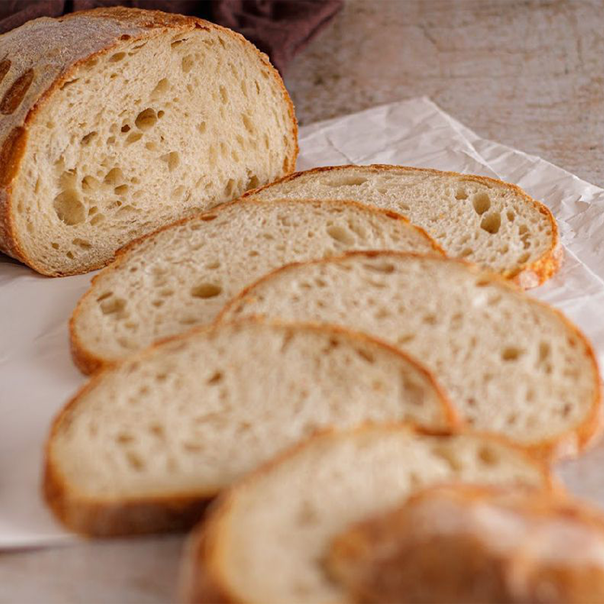 خبزنا المخمر مصنوع من الدقيق والماء والملح فقط، ويُخمّر طبيعيًا بدون خميرة فورية. بسيط، نقي، وغني بالنكهة.